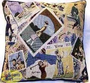 Product Description : Lady Golf - pillows have a medium blue denim backing and medium blue piping. Made from original fabrics. Pillow is edged in twisted rayon cordedge in coordinating colors. Size: 18".