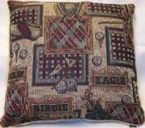 Product Description : Fairway Golf pillows have a medium green denim backing, tan or black piping. Made from original fabrics. Pillow is edged in twisted rayon cordedge in coordinating colors. Size: 14".