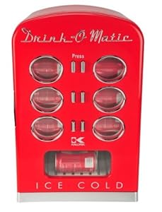 Product Description : Collectors will love the RETRO themed detailing on this nostalgic vending fridge. Its red exterior features the Drink O Matic logo in polished chrome and the words "Ice Cold" below the open compartment at the bottom. The unit can hold up to twelve 12-ounce cans. To further evoke a nostalgic trip down memory lane, the fridge will dispense the beverage of choice at the push of a button vending-machine style. The unit cools up to 30 degrees F below the ambient temperature, and its thermoelectric cooling system runs quietly and efficiently, without any of the noise or vibration associated with compressor-style units. The vending fridge runs on 110-volt AC power for use at home or at the office, but can also operate using 12-volt DC power for tailgating parties or when entertaining on a boat. Patented design. Can cooler with automatic dispenser function. Holds 12 cans. Chrome logo. Chrome handle and window frame. 6 press buttons : only press a button and retrieve cold can in the dispenser area. Thermoelectric cooling with Peltier elements - CFC free. Cooling by 15 to 18C (27 to 32F @ 75F ambient) below ambient temperature, with thermostat regulation. UL adapter. Unit Size: 15.7" x 22.4" x 13.8" (40 x 57 x 40cm).